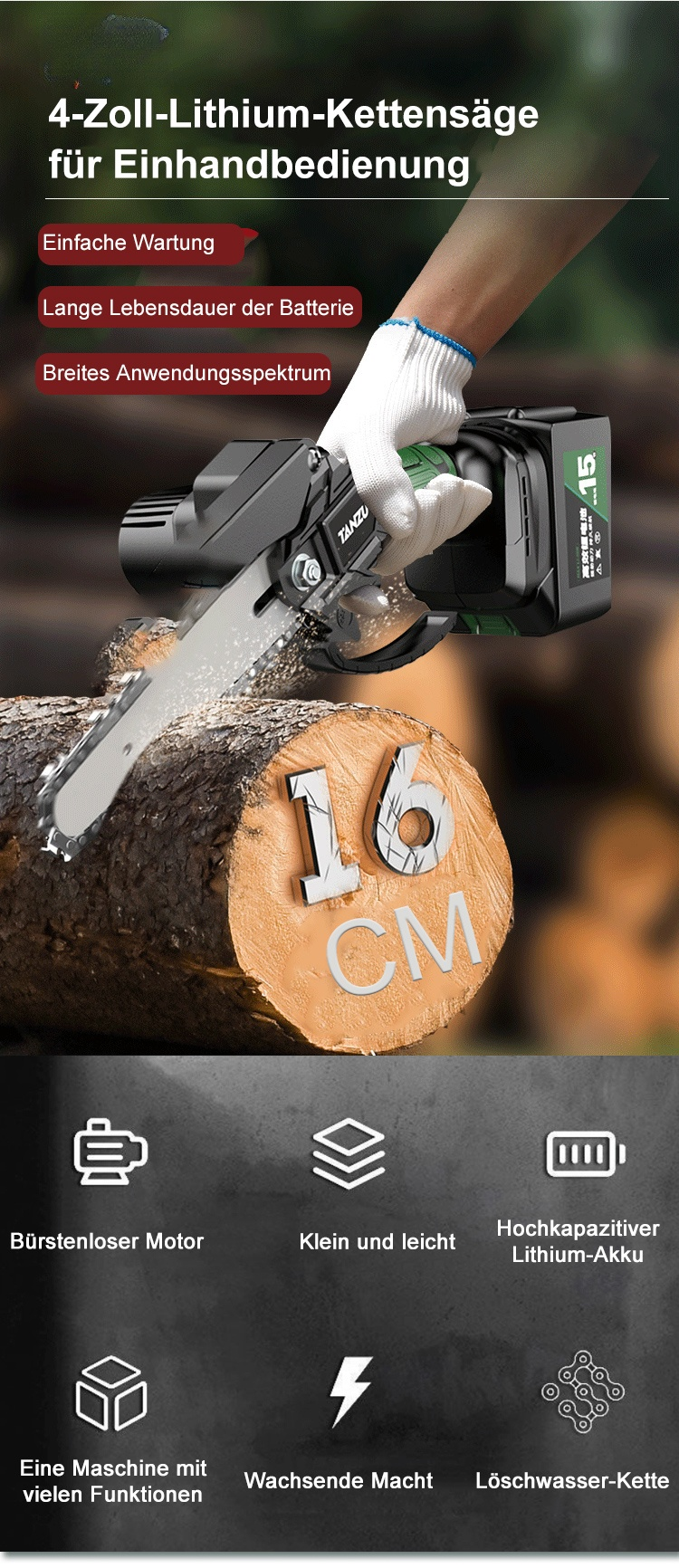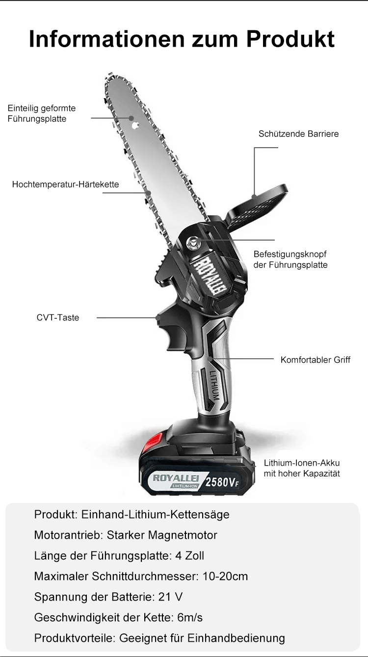 4-Zoll-Lithium-Kettensäge für Einhandbedienung