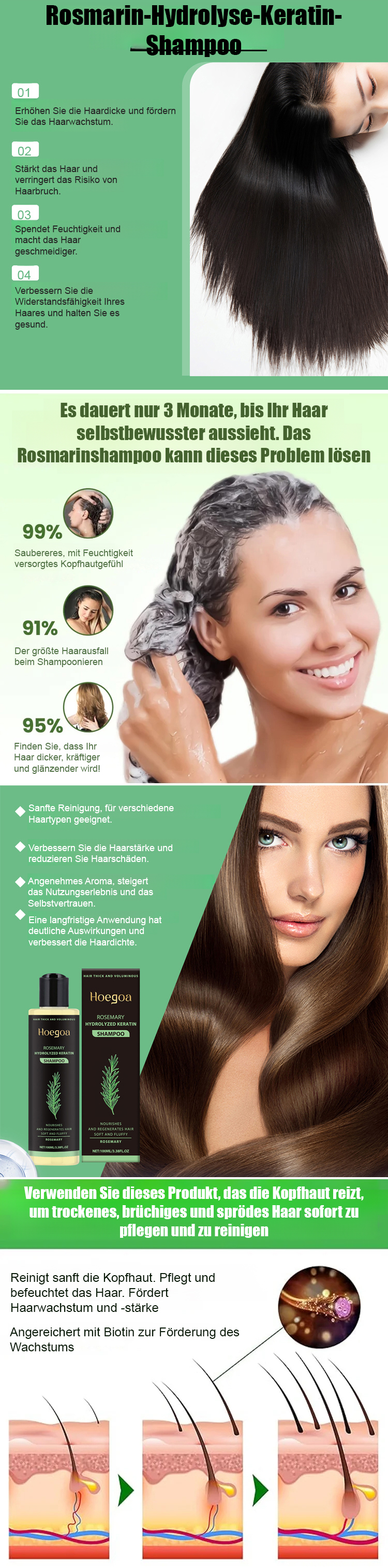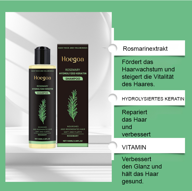 Dieses von Dermatologen empfohlene Haarpflegeprodukt enthält eine hohe Konzentration an Rosmarinextrakt, um die Aktivität der Haarfollikel anzuregen und das Haarwachstum zu fördern. Es ist wirksam bei stressbedingtem Haarausfall, Haarausfall nach der Geburt, Haarausfall durch Färben und Dauerwellen sowie erblich bedingtem Haarausfall. Zugesetztes hydrolysiertes Keratin repariert geschädigte Haaroberflächen und löst Probleme wie Trockenheit, Spliss und Verfilzungen. Das Ergebnis ist geschmeidiges und seidiges Haar. Nährstoffe wie Vitamin C und Vitamin E pflegen die Kopfhaut, regulieren die Talgproduktion und verbessern fettige und juckende Kopfhaut. Die Kopfhaut bleibt sauber und gesund, wodurch optimale Bedingungen für gesundes Haarwachstum geschaffen werden.