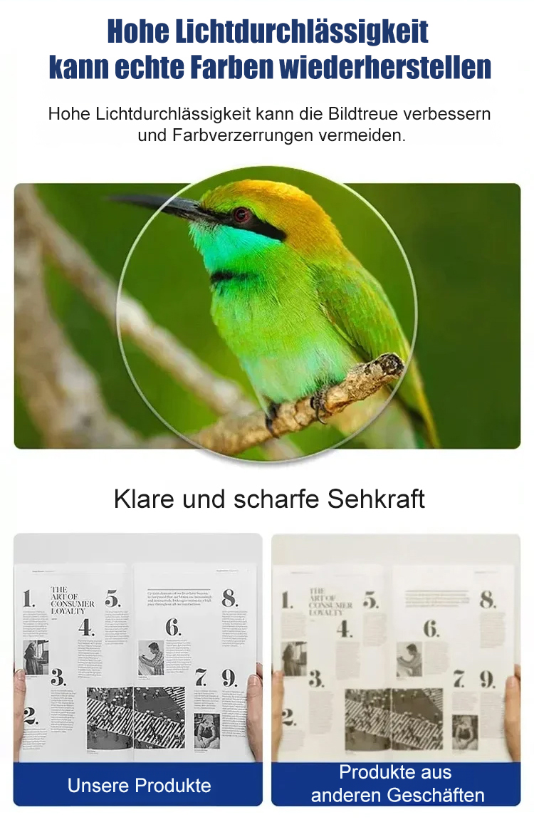 👓Diese Brille ist mit importierten asphärischen Harzgläsern ausgestattet, die eine Lichtdurchlässigkeit von bis zu 99,8 % aufweisen. Sie blockiert intelligent blaues Licht und sorgt für ein klares, verzerrungsfreies Seherlebnis. Der Rahmen besteht aus ultraleichtem Material in Luft- und Raumfahrtqualität und wiegt nur 8 Gramm. 😀So werden Sie auch nach bis zu 10 Stunden Tragezeit keinen Druck oder Schmerzen verspüren. Die Brille sitzt sicher und angenehm.
