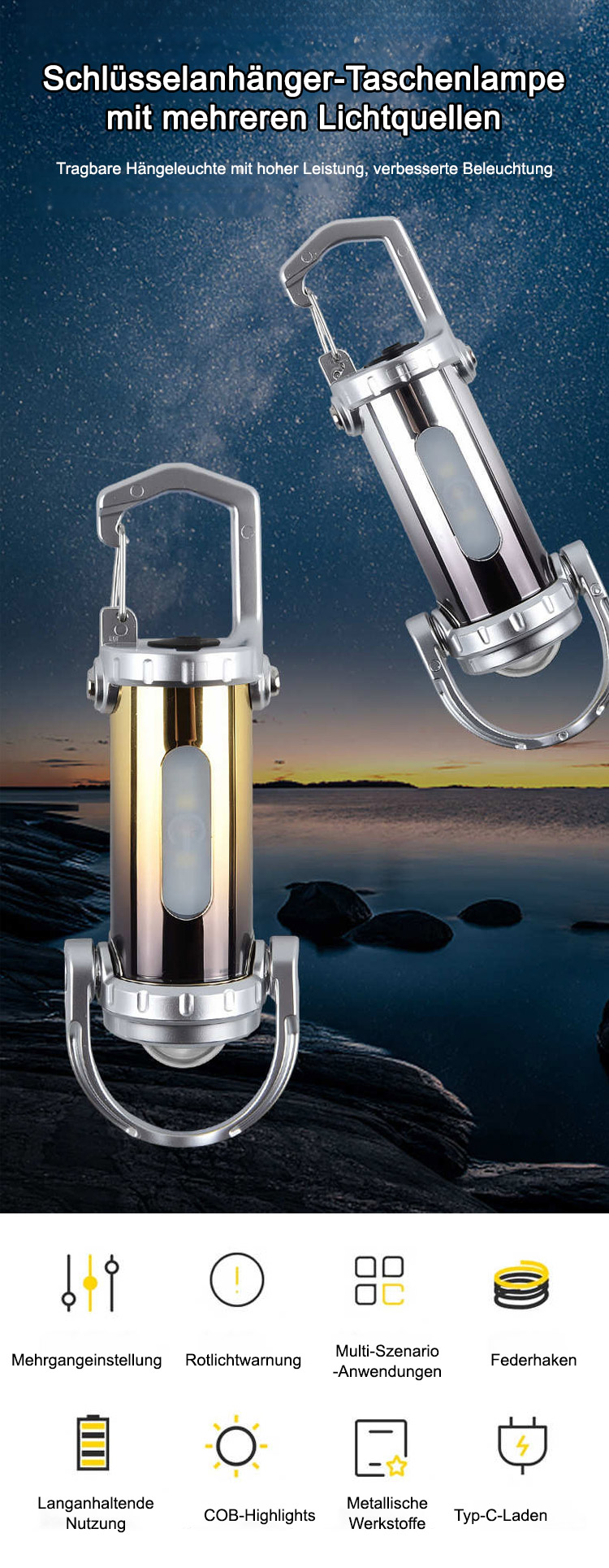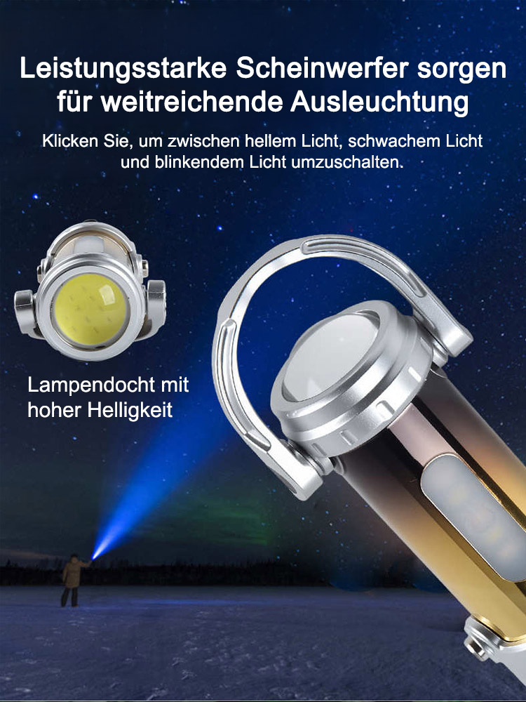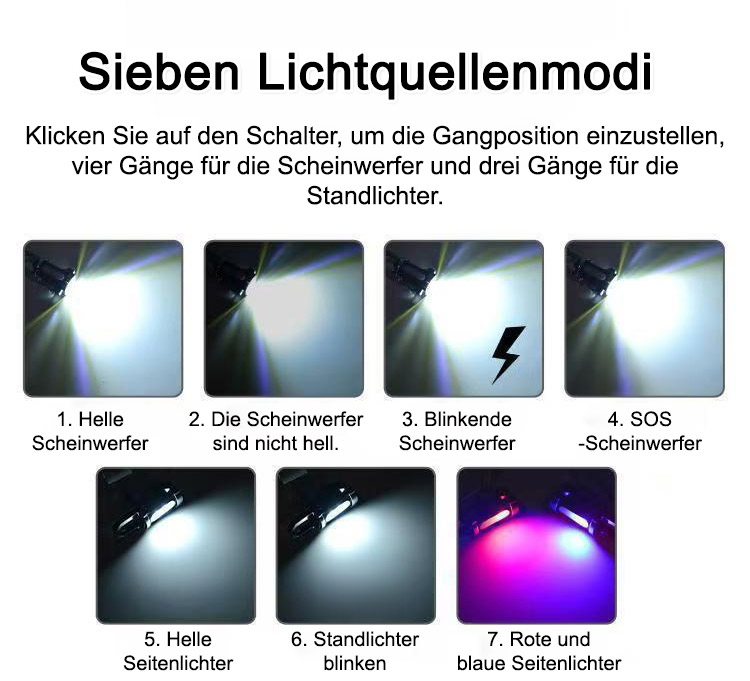 🔥Zwei Lichtquellen: LED + COB-Lampenkern, Helligkeit bis zu 1000 Lumen – 20-mal heller als eine herkömmliche Handy-Taschenlampe. 5 Helligkeitsstufen und 7 Lichtmodi für einfaches Umschalten. 💯Fernlicht, Abblendlicht, Stroboskop, SOS-Notsignal und Rot-/Blaulichtwarnung für maximale Flexibilität in verschiedenen Situationen. ✅Direktes Laden über USB-C, integrierter Lithium-Akku mit hoher Kapazität und Schutz vor Überladung und Tiefentladung. 3 Stunden Ladezeit ermöglichen ca. 2 Stunden Leuchtdauer.