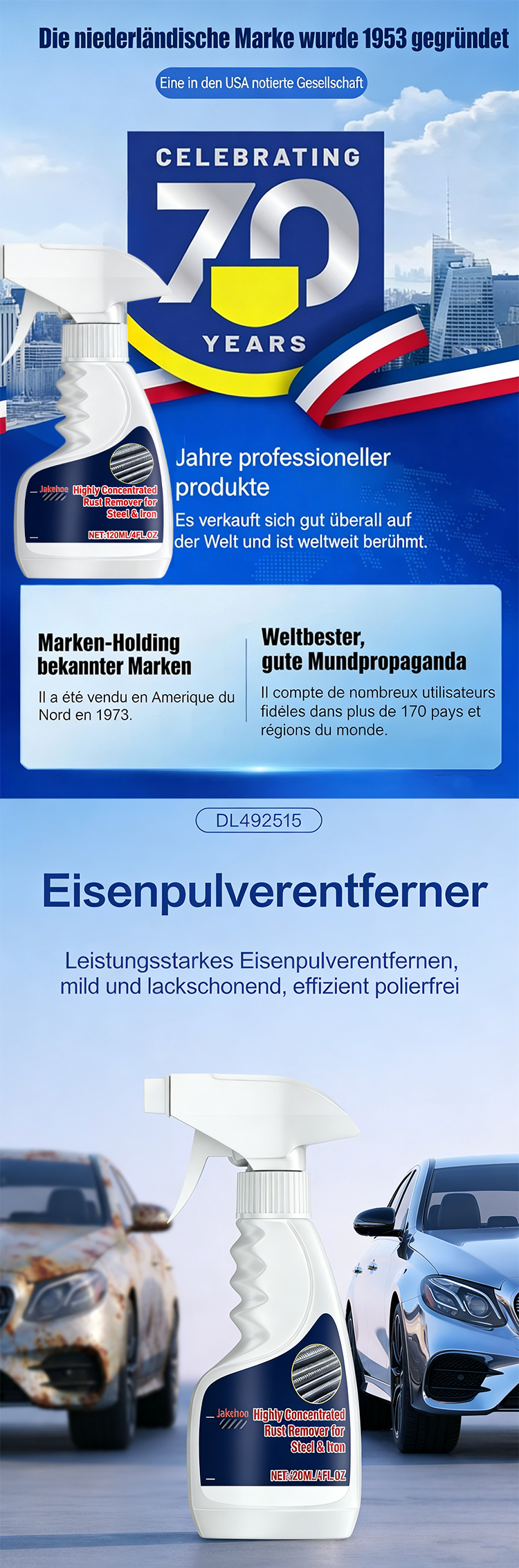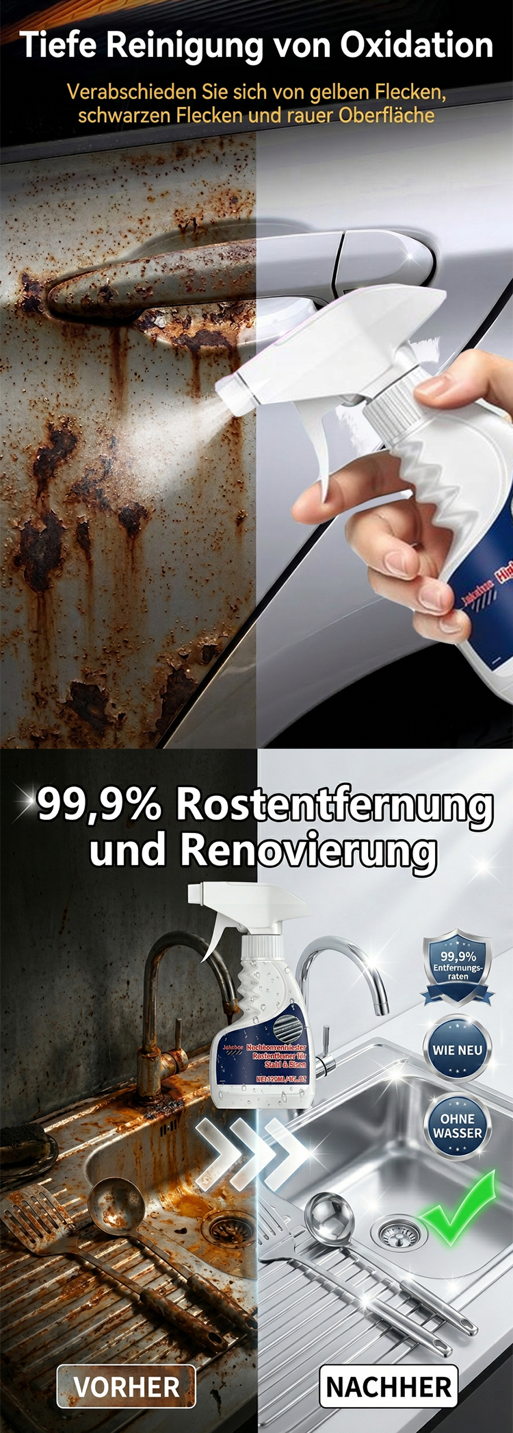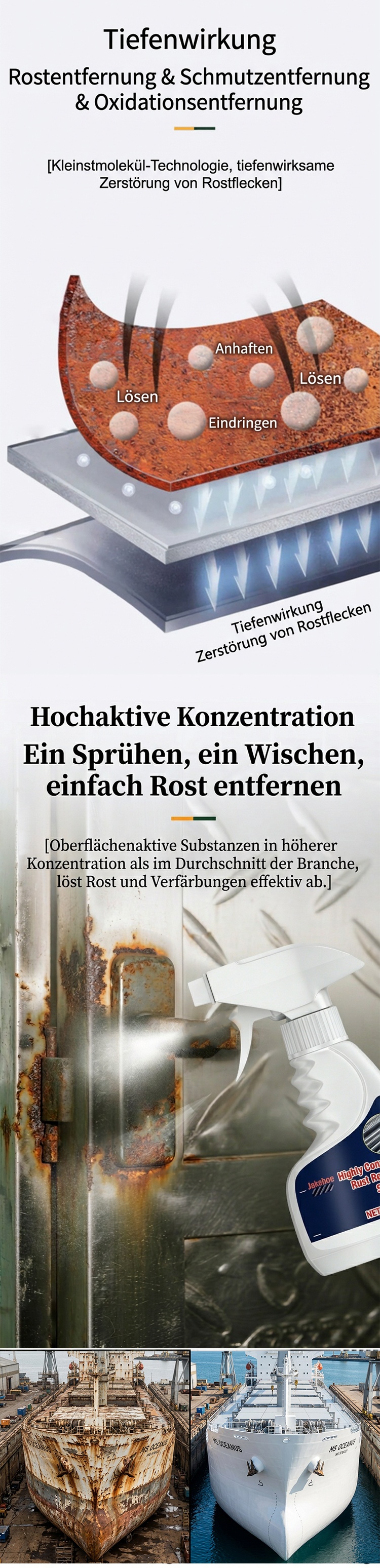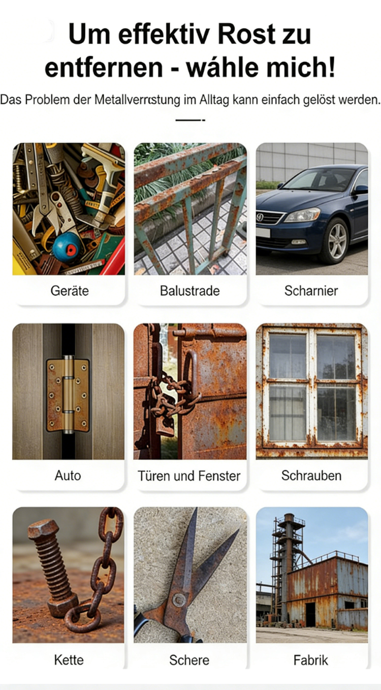 👍 Ob Rost an Schrauben, Spülbecken oder Türklinken zu Hause, Korrosion an Maschinen, Zahnrädern und Werkzeugen in der Fabrik oder selbst hartnäckiger Rost an großen Metallkonstruktionen – dieses Produkt beseitigt alles im Handumdrehen! ✅ Die kleinen Moleküle dringen schnell in die Metalloberfläche ein und lösen und entfernen Rost und Oxide. Kein mühsames Schrubben nötig; einfach aufsprühen und abwischen, und Sie sehen bereits nach einer Minute sichtbare Ergebnisse. 🔥 Selbst stark verrostete Stellen werden vollständig entfernt, sodass das Metall seinen ursprünglichen Glanz zurückerhält.