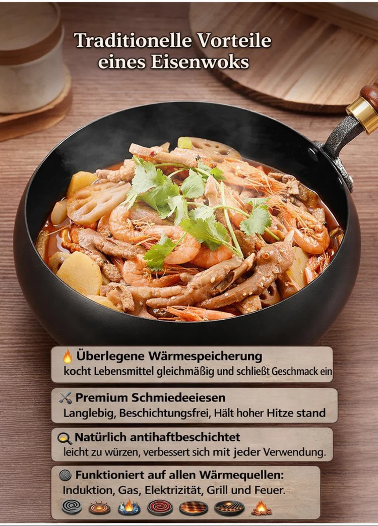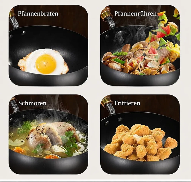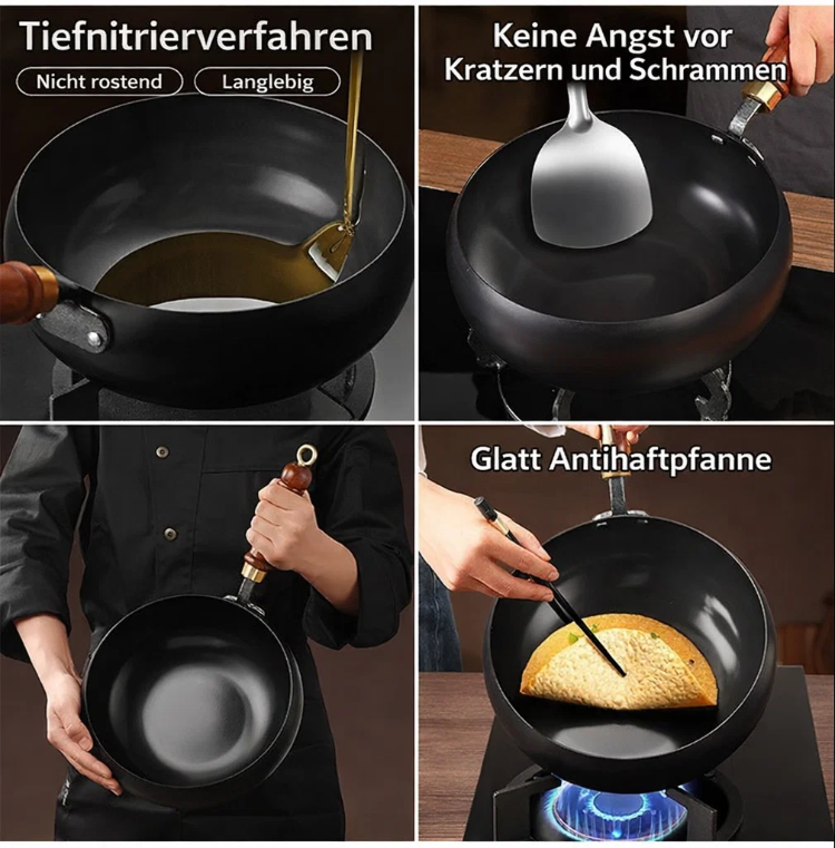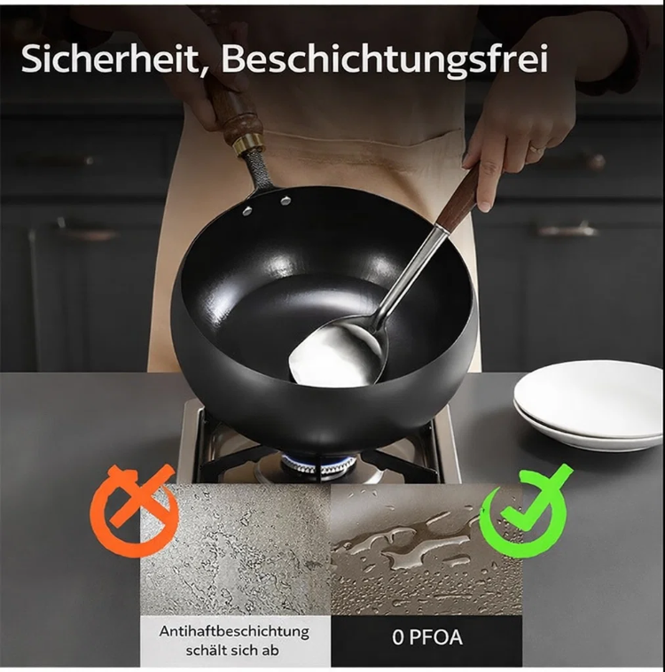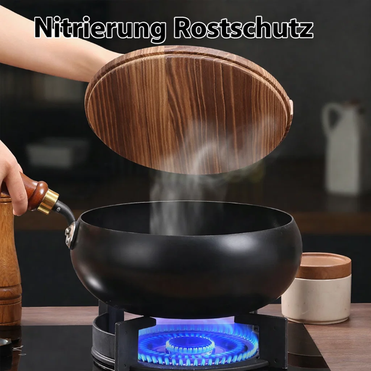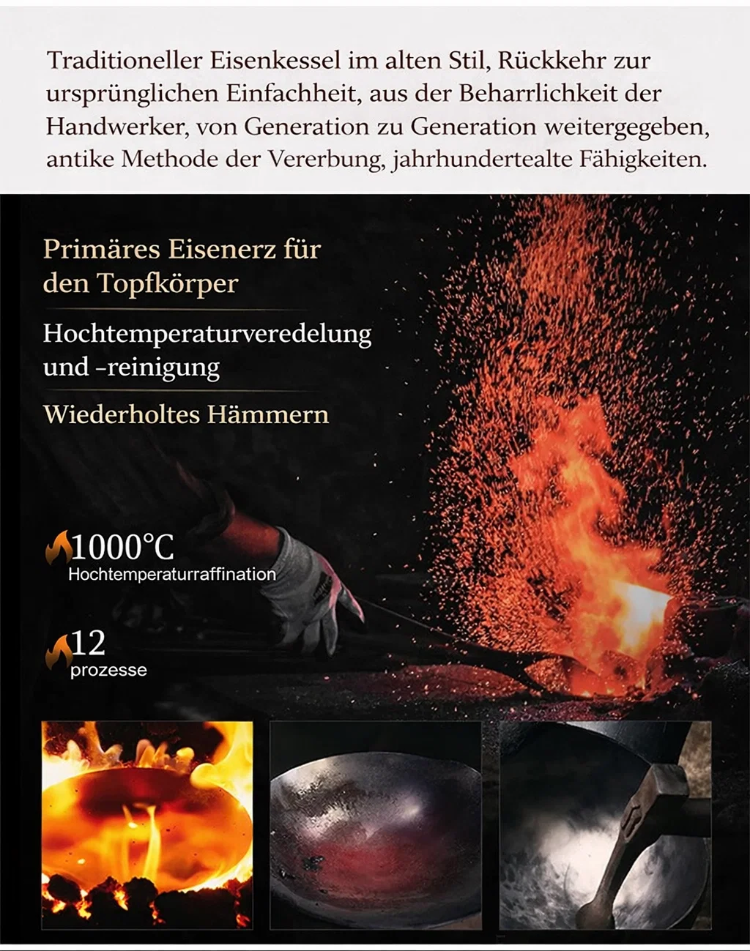 👍Bei 1000 °C veredelt und in 12 traditionellen Verfahren geschmiedet, kombiniert mit einer Tiefennitrierung zum Schutz vor Rost, 🔥ist der Topf robust, langlebig und widerstandsfähig gegen Verformung, Kratzer und Stöße. Er ist unbeschichtet, bewahrt 100 % Frische 🥰und garantiert köstliches und aromatisches Kochen. Er erhitzt sich gleichmäßig ohne Anbrennen und eignet sich daher perfekt zum Braten, Pfannenrühren, Schmoren und Dünsten – alles in einem Topf!