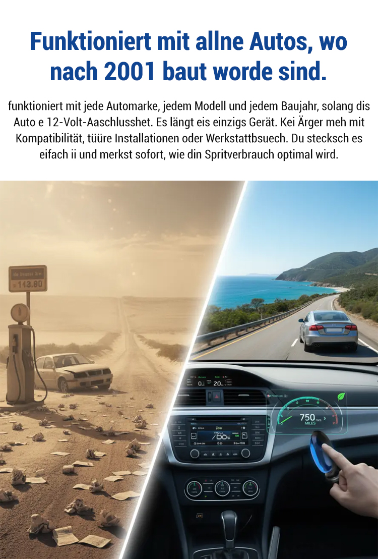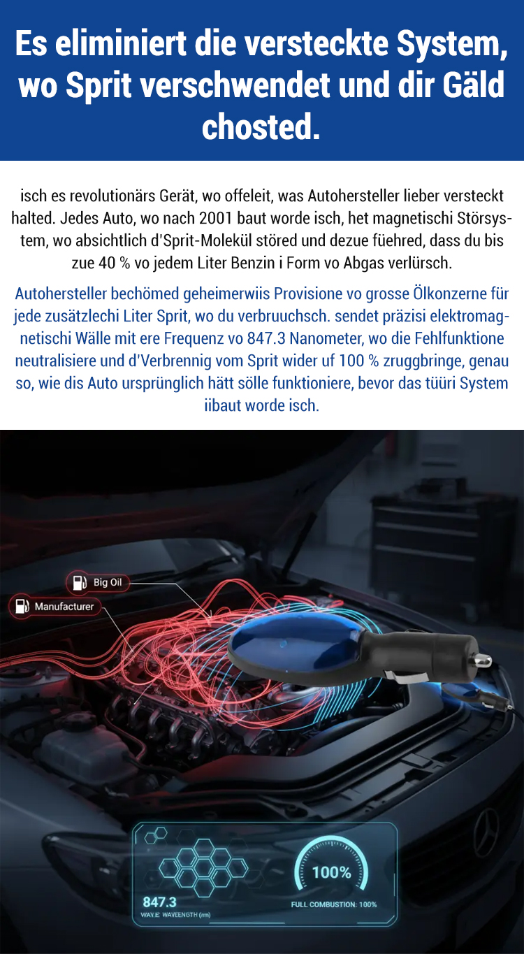 Eine bahnbrechende Weiterentwicklung in der automobilen Energiespartechnologie! Zertifiziert vom Powertrain Engineering Research Institute! Präzise elektromagnetische Wellen mit einer Wellenlänge von 847,3 Nanometern reorganisieren ungeordnete Kraftstoffmoleküle und gewährleisten so die vollständige Verbrennung jedes einzelnen Tropfens. Dies reduziert Kraftstoffverluste um 40 %, senkt den Kraftstoffverbrauch um 50 % und erhöht die Reichweite um 56 %. Gleichzeitig werden eine stärkere Beschleunigung, ein ruhigerer Leerlauf, ein direkteres Ansprechverhalten des Gaspedals und deutlich reduzierte Abgasemissionen erzielt.